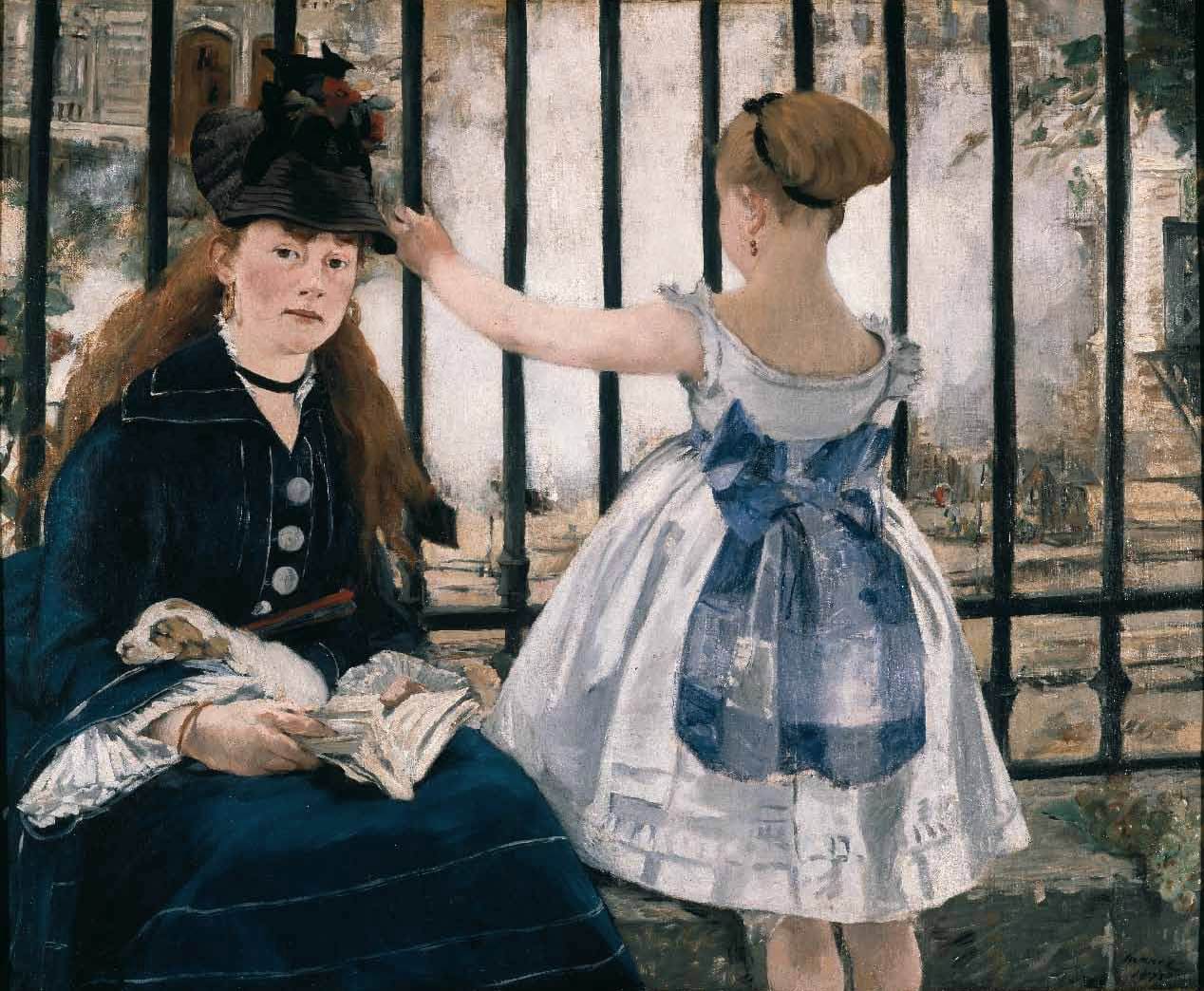 在《铁路》这幅画中,可以更明显地看到,观者希望翻转画布的冲动、进行移动的欲求,实质上都是由画面中目光以及目光投射方向的游戏所引起的。在横纵线构成的栏杆外,妇人捧着书、但目光被画面外的场景所吸引,并投入地发出注视;而背对着观者的小女孩在看的东西,由于升腾起来的火车蒸汽,同样无法让观者看清。为了看到应该看的东西,要么从小女孩的肩头,要么把画面翻转过去从妇人的肩头往前看。此时,画面中妇人与女孩的目光成为了画外观者移动的诱导,而恰恰是由于观者自由地、希望移动的冲动,导致其开始接触到这幅作品的物质性,即认识到画框本身所限制的内容、所划定的边缘以及油画面积本身。
